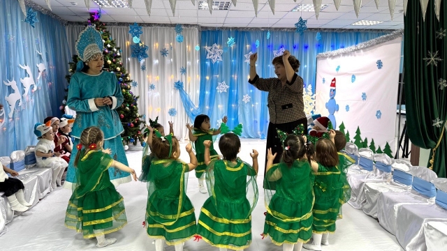 Бөбекжайымызда Жаңа жыл мерекесіне орай ән-саз залында ертеңгіліктер өтті. Балаларға жаңа жыл мерекесінің мазмұнын терең түсіндіру, ән айту, би билеу, сахналық көріністер арқылы балалардың өнерге деген қызығушылығын арттыру.